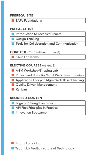 An adaptive, dynamic and responsive structure designed to grow with FedEx. Core classes, asynchronous online instruction and conferences create a common knowledge level, while electives allow for customization based on each individual’s experience.