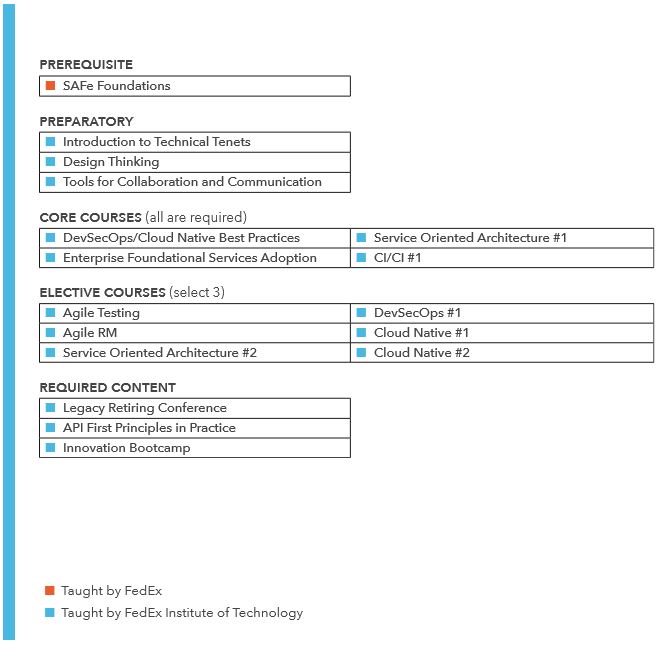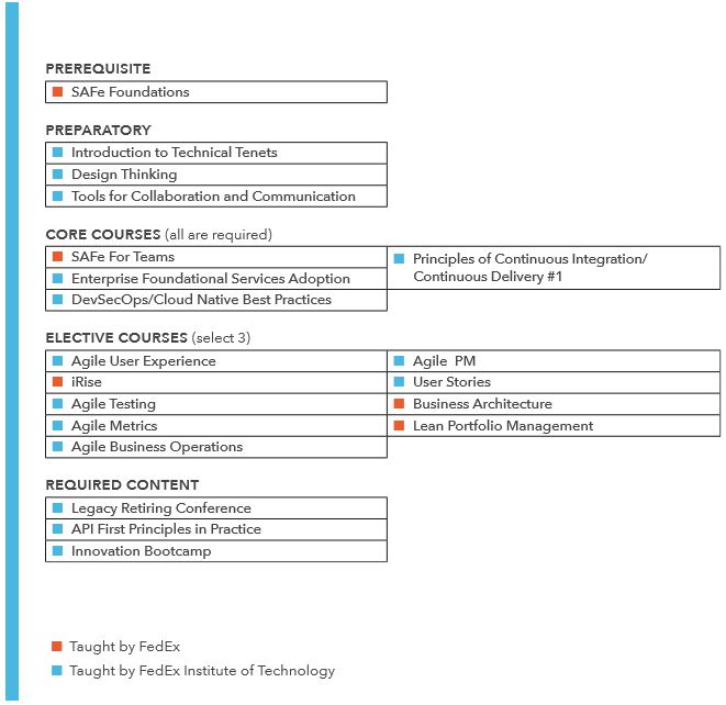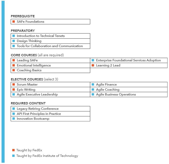 The Academy is an exciting new partnership between the FedEx Institute of Technology and FedEx IT Education and Development to meet the FedEx Corporation's goal of transforming the company through the implementation of eight renewal technical tenets. The pilot for this program was developed with the FedEx Center for Agile Transformation (FCAT, formerly SATO) between June 2017 and February 2018. Focusing on the SAFe tenet, the pilot featured original courses developed by faculty researchers from around the world and leaders in the Agile space in partnership with FedEx SME's and product owners. The success of this partnership has led to the development of The Academy, a resource that will provide a comprehensive training solution for all eight renewal technical tenets to FedEx. The Academy will operate in concert with IT Education and Development, and through this collaboration will solve the renewal challenge at FedEx.