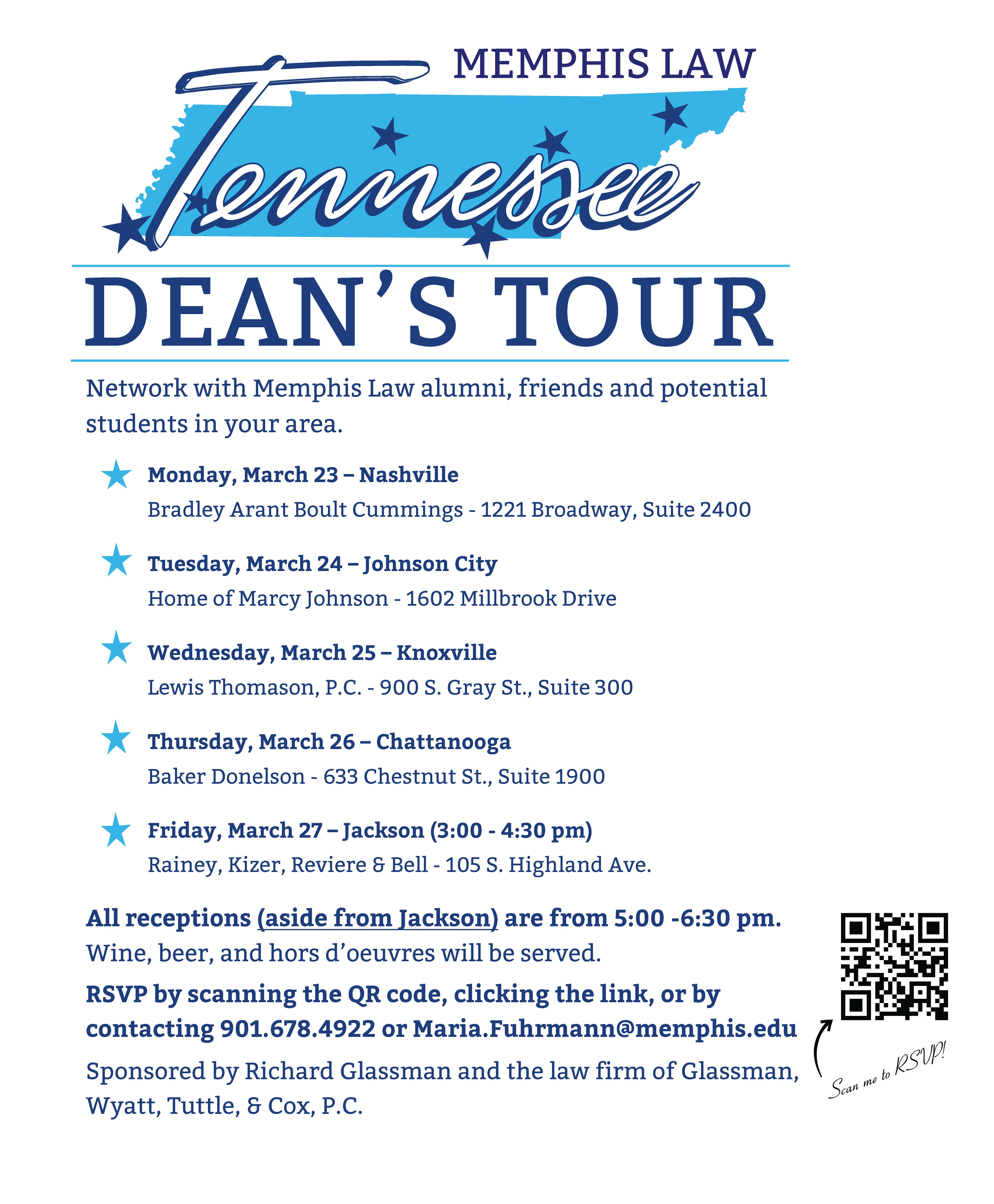 Dean Strickland will embark upon a statewide "Dean's Tour" across Tennessee in late-March, with stops in Jackson, Nashville, Chattanooga, Johnson City, and Nashville. Join him and catch up with fellow alumni, meet prospective students, and see old friends. Click HERE for more information.