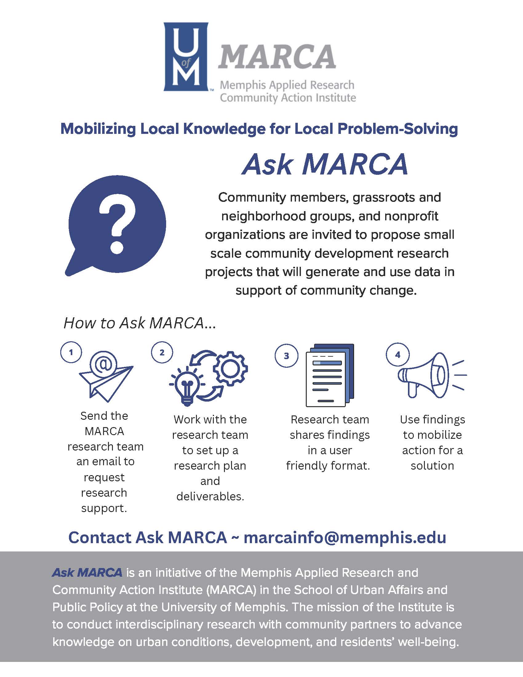 Complete the Ask MARCA Request Form or send an email to marcainfo@memphis.edu. A MARCA team member will follow up with a phone call to help us better understand the research needs and assess the feasibility of the request. infographic