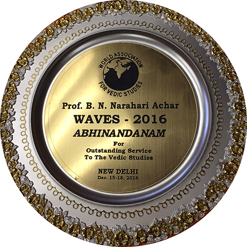 Dr. Achar also received the World Association for Vedic Studies (WAVES) 2016 Abhinandanam for Outstanding Service to the Vedic Studies, New Delhi, December 2016. See Award.