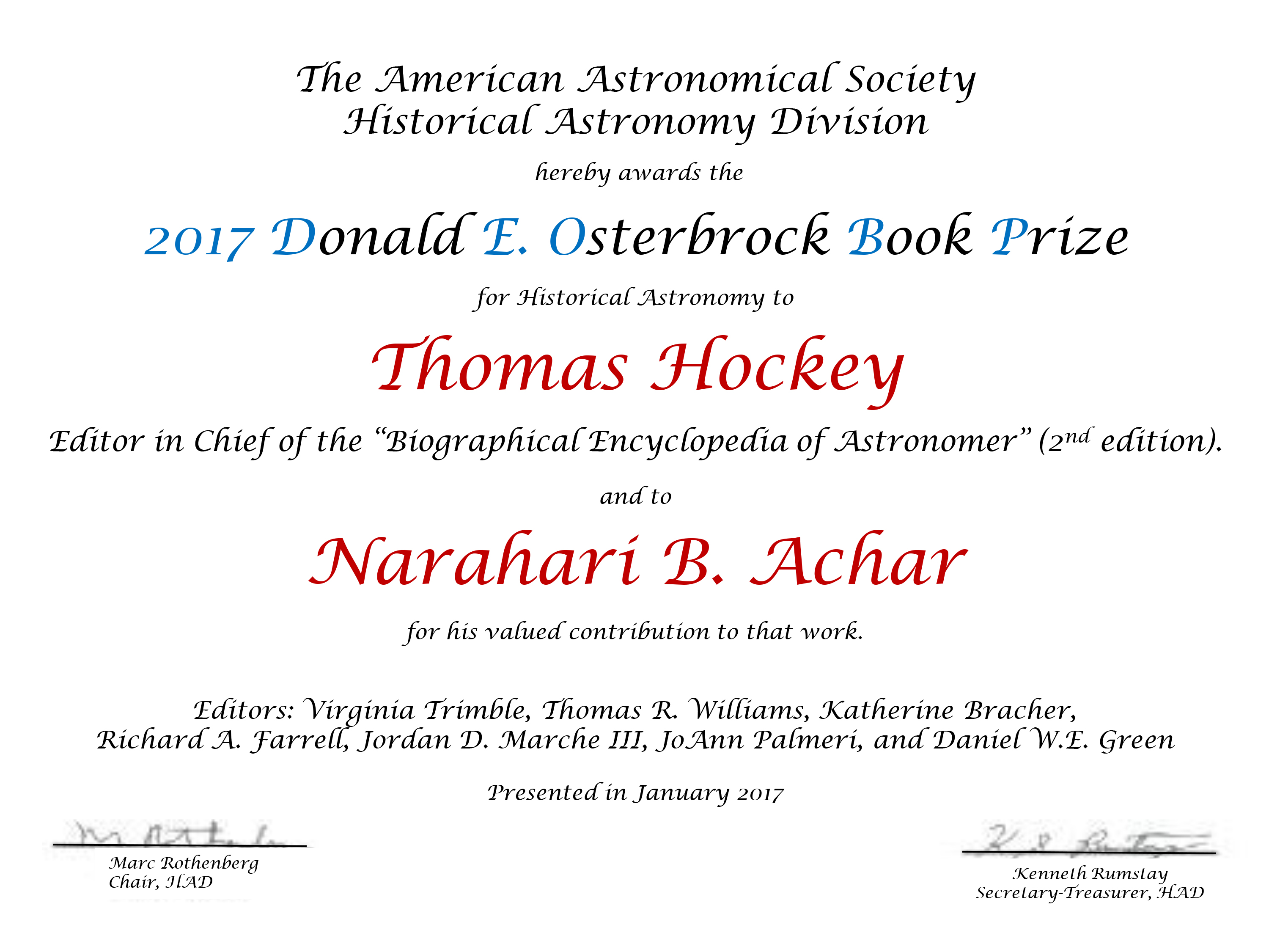 Dr. Narahari Achar received the Donald E. Osterbrock Prize for his contribution to the Biographical
